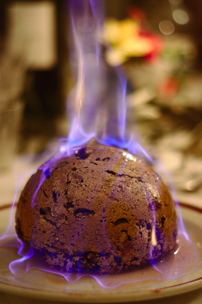 A brandy-vel meglocsolt pudingot meggyújtják tálaláskor. Forrás: Ed g2s , CC BY-SA 4.0, wikipedia