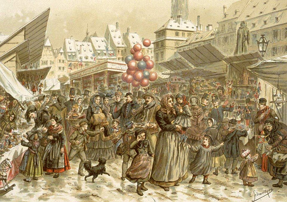 A karácsonyi vásár ábrázolása a strasbourgi Place Kléber-en, Franciaországban, 1859-ben. Forrás: Emile Schweitzer, wikipedia