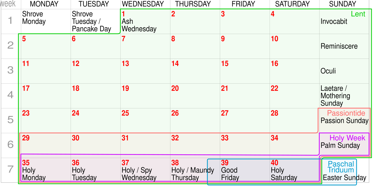 A keresztény egyházi év egyik legcsendesebb és legelmélyültebb időszaka a nagyböjt. Ez az időszak –, amely különleges lelki utazásra hívja a hívőket –, minden évben máskor kezdődik, mert a húsvét dátuma változó: a tavaszi napéjegyenlőséget követő első holdtölte utáni vasárnap határozza meg. Emiatt a nagyböjt kezdete is évről évre eltolódik. 2026-ban a böjti időszak február 18-án, hamvazószerdán veszi kezdetét, és egészen április elejéig tart (húsvét), amikor a keresztény világ Krisztus feltámadását ünnepli. A lenti képen látható a negyven napos böjti időszak: 1. nap hamvazószerda, 35-40. nap nagyhét. Nagypéntek április 3-án lesz 2026-ban, ami azt jelenti, hogy húsvétvasárnap 2026-ban április 5-én lesz, húsvéthétfő pedig április 6-án. A közbeeső HAT vasárnap nem tartozik a böjti napokhoz.
