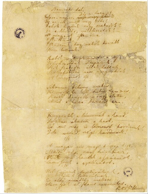 A Nemzeti dal kézirata. Forrás: wikipedia