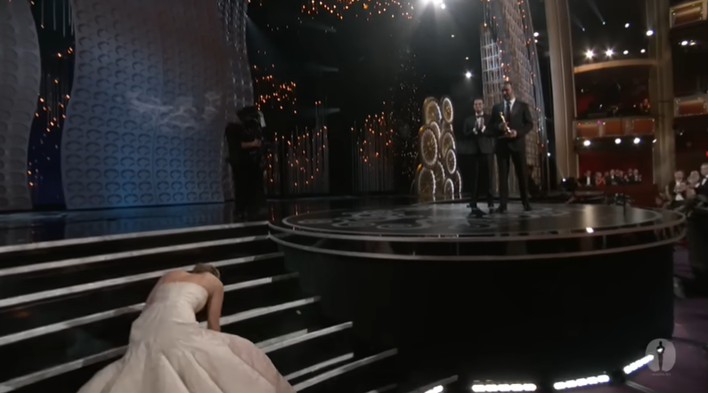 Jennifer Lawrence a legjobb női főszereplőnek járó Oscar-díjat akarta átvenni a Napos oldal című filmben nyújtott alakításáért, amikor épp a "legjobb" pillanatban elhasalt. "Elborzadtam" – emlékezett vissza a négyszeres Oscar-díjas produkciós tervező, Derek McLane, aki a közönség soraiban ült. – "Azt hittem, valaki kiöntött valamit, aztán rájöttem, hogy a ruhájában botlott meg". Szerencsére a színésznő nem drámázott az esés miatt, összekapta magát, folytatta útját, és a jelenlévők állótapssal jutalmazták.